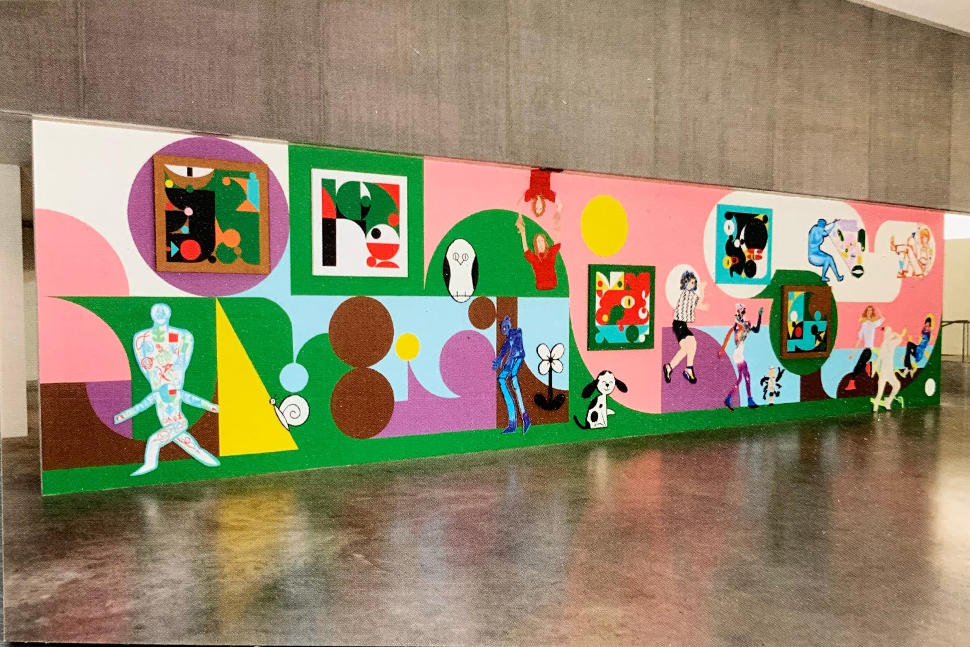 This postcard features Ad Minoliti's Manifestacion pluriversal on the performance space wall.