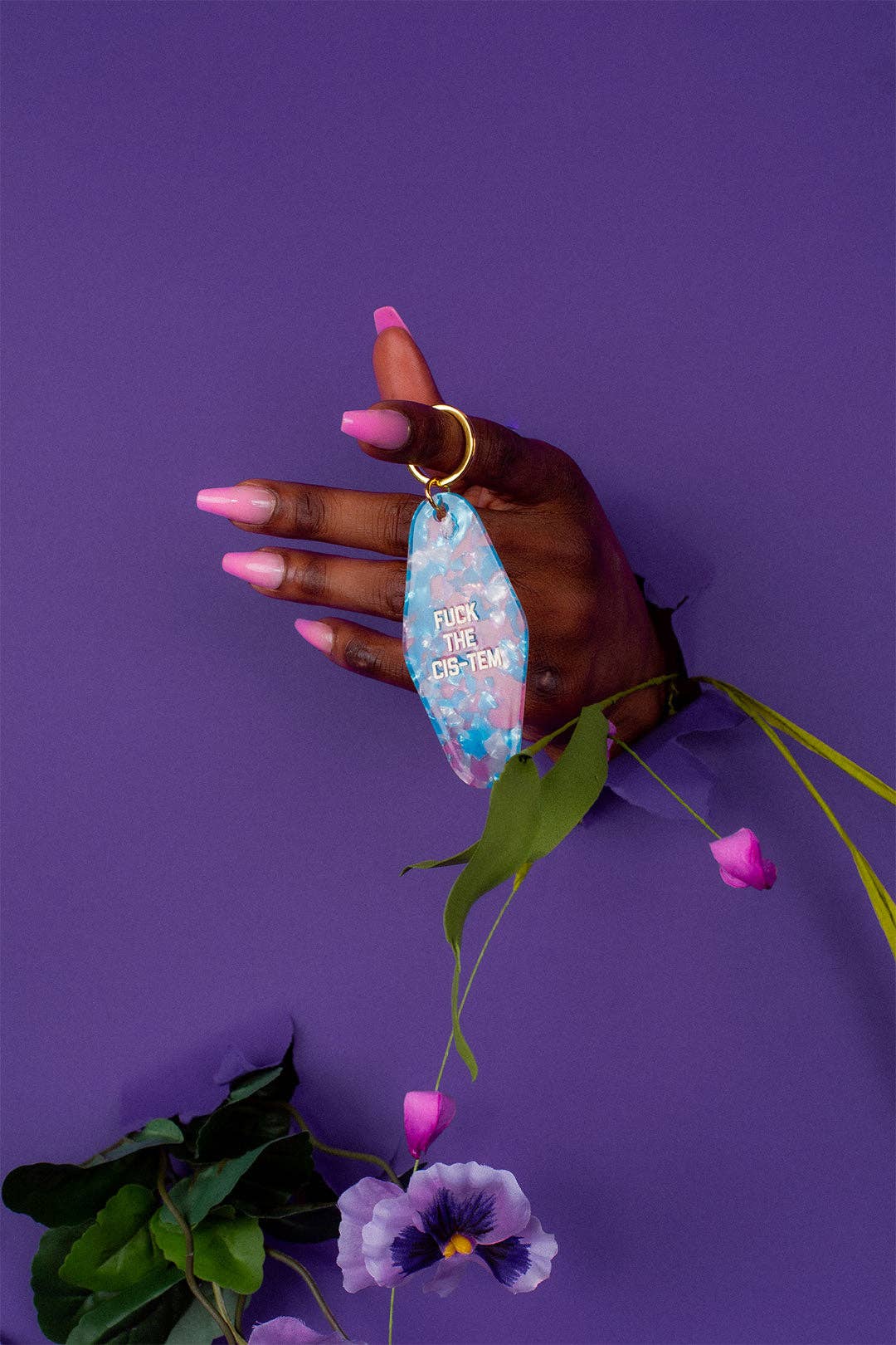 * Blue, Pink & White Marbled, Semi-Translucent Acrylic * White Embossed "Fuck The Cis-Tem" * One-Sided * 3.5" x 1.75" * 1" Gold Keyring