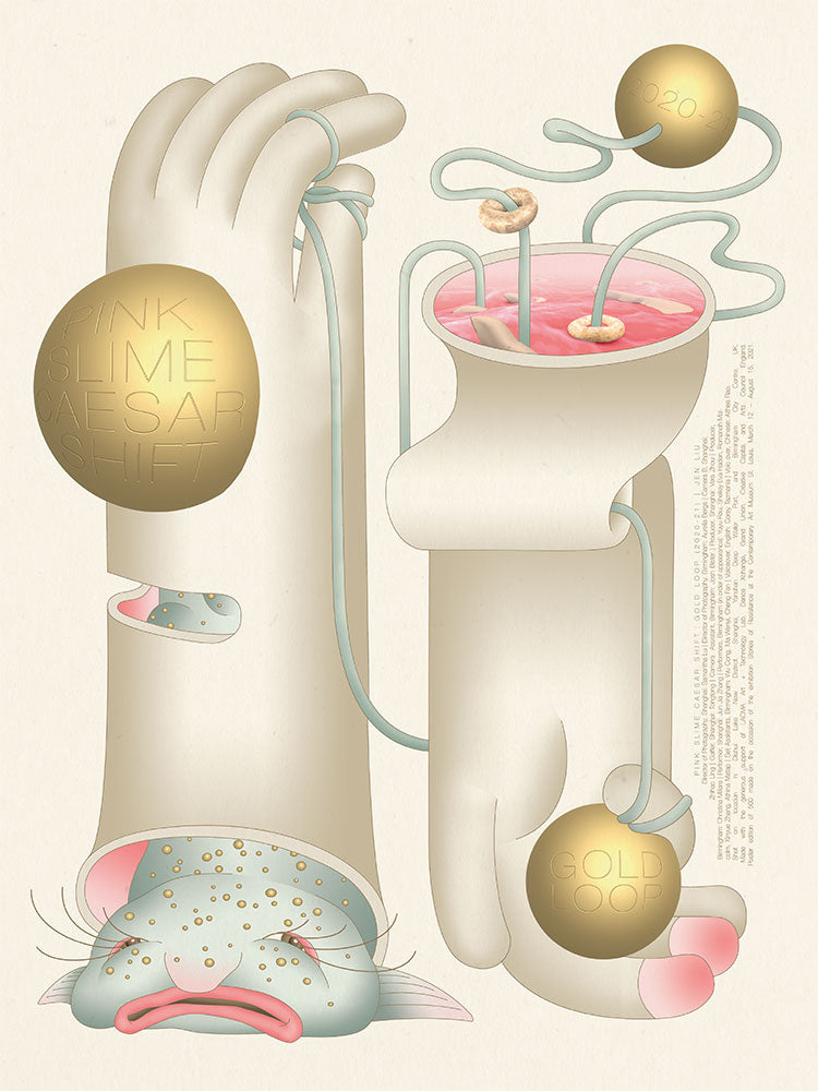 A limited-edition film poster by Jen Liu, made on the occasion of her video Pink Slime Caesar Shift: Gold Loop (2020–21) in the exhibition Stories of Resistance. The video is a reflection on e-waste, political resistance, industrial poisoning, and disappearing activists.