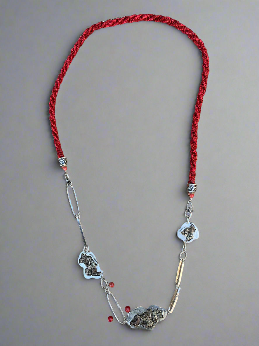 Made by Leigh Roberts, this handmade piece is a sterling silver necklace with perforated nickel silver, red coral gemstones, and a handwoven neck cord.