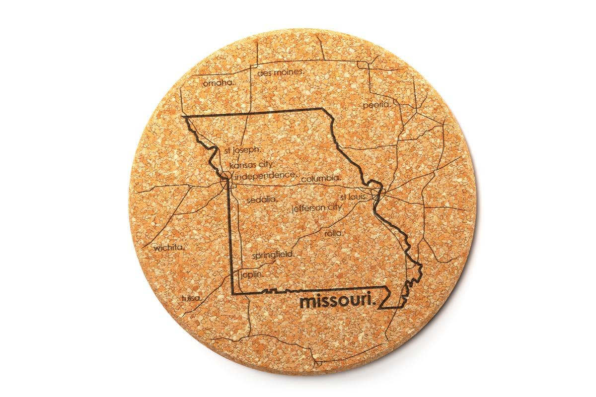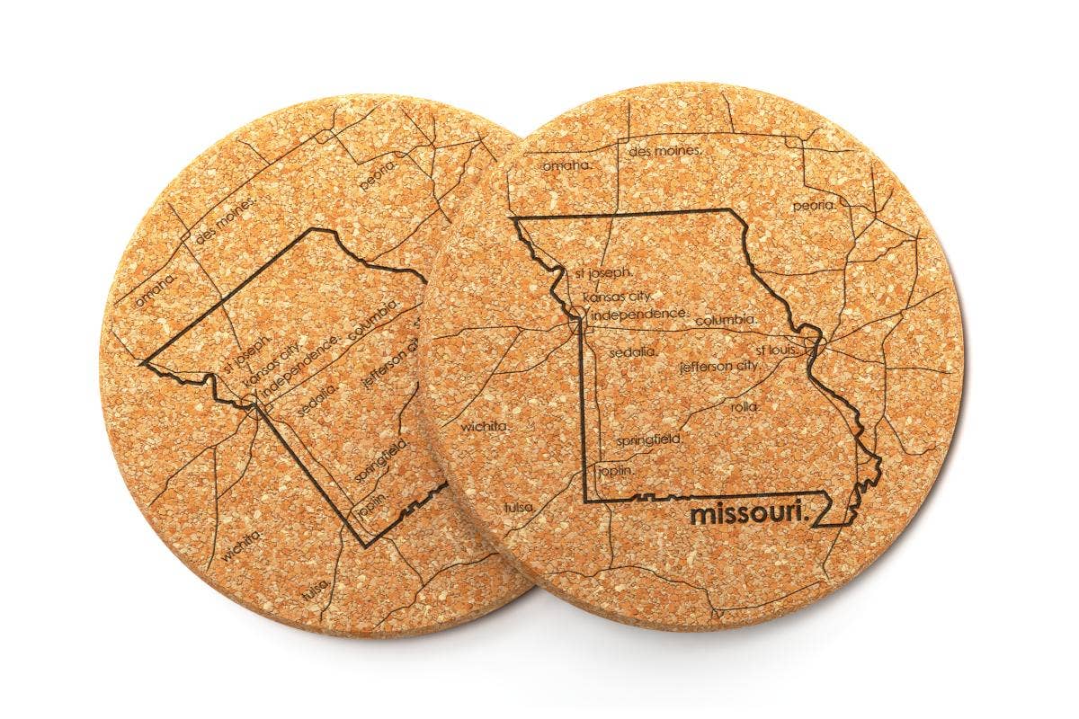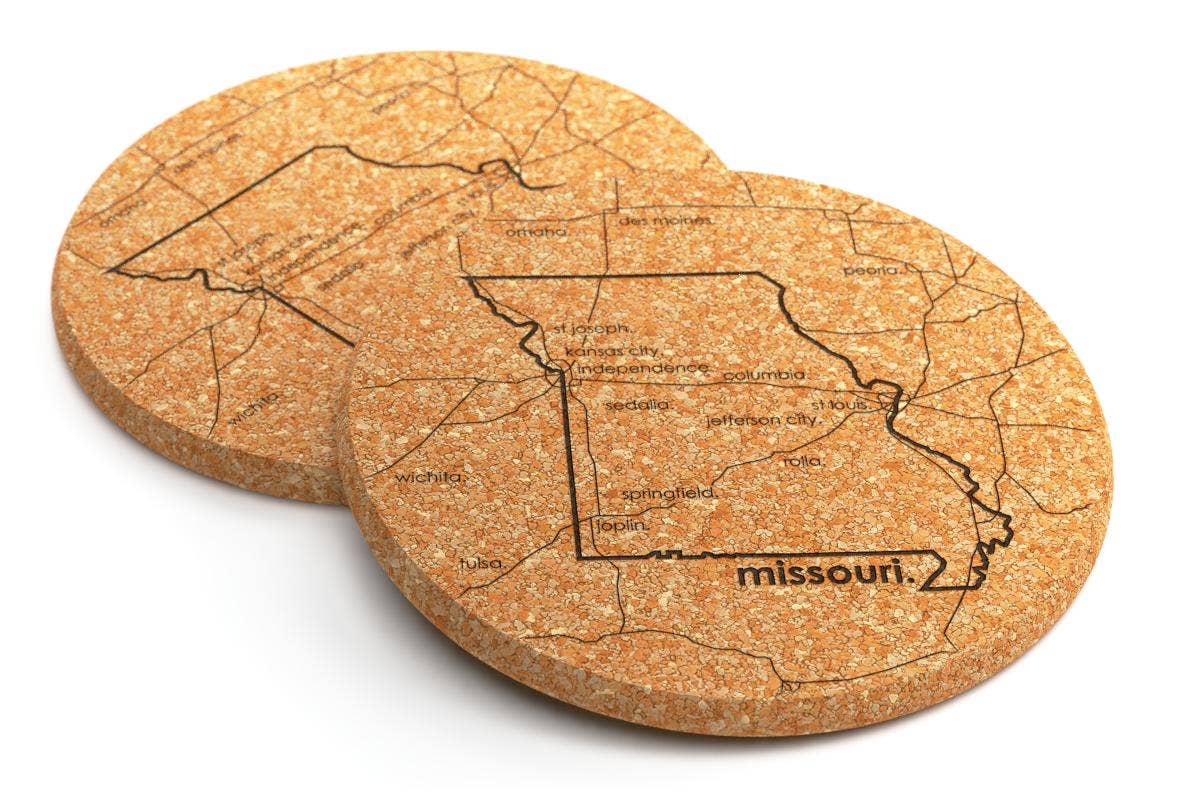 Show your state pride with our modern cork coasters etched with the iconic borders, roads, and cities of the great state of Missouri. The lightweight and absorbent cork material protect your tabletop while the stylishly engraved state design serves as a great conversation starter. Each set of 2 coasters comes packaged in a stylish muslin bag. Merchandise with our bestselling Map Glassware for a unique and personalized gift set. Cork imported. Dimensions - 4" dia x 0.25" thick.