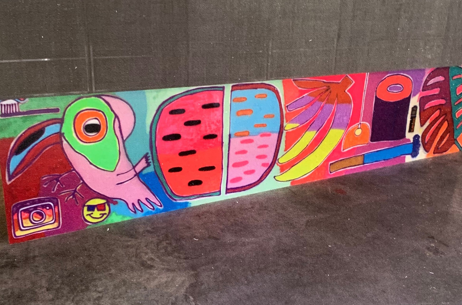 This postcard features Katherine Berhardt's installation on the Performance Space wall.