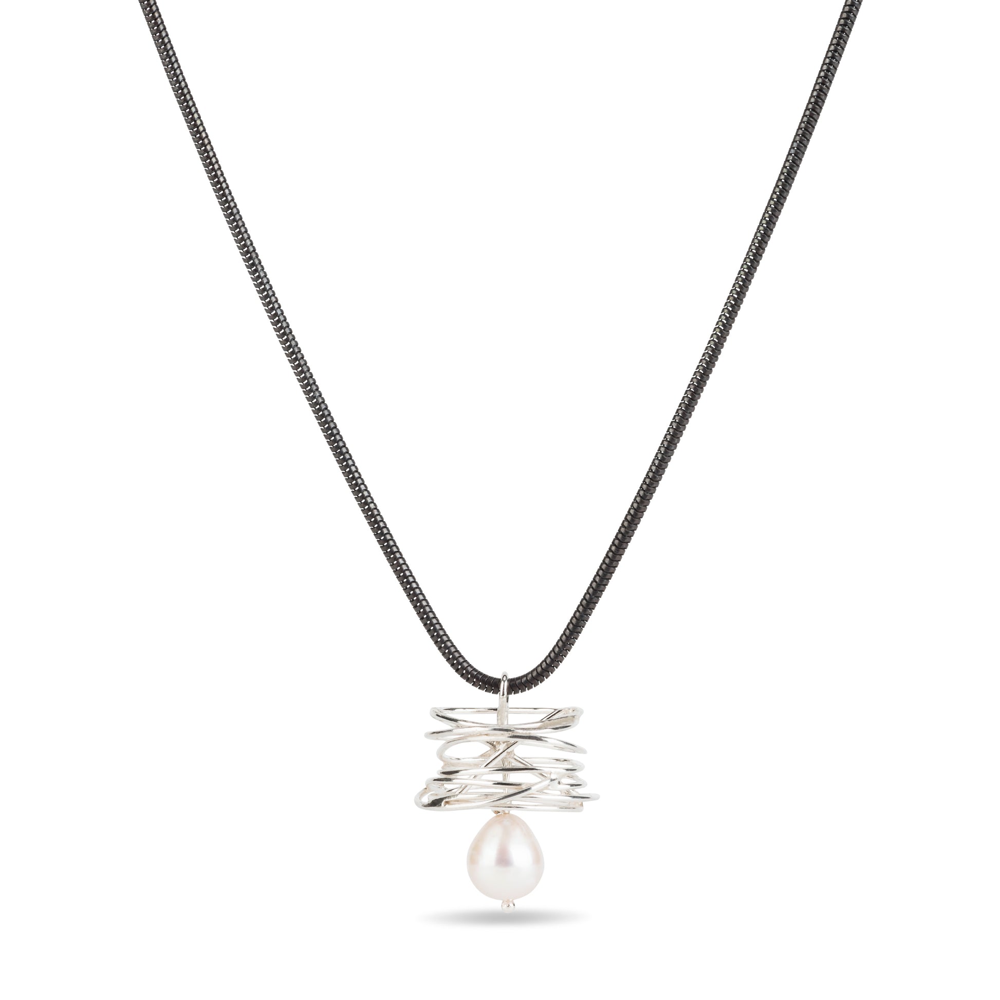 Each pendant is created by hand in Sterling Silver, curving the bright metal into a visual tornado and affixing a Baroque Pearl at its base. The 18-inch chain of this flattering necklace is oxidized by hand using a fine paint brush.